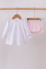 Celebrate the holiday season in style with this Pink Christmas Tree Embroidery Bloomer Set. Featuring festive pink fabric adorned with charming embroidered Christmas trees, this playful outfit adds a touch of holiday cheer to your little one’s wardrobe. Perfect for cozy gatherings or festive photo ops, the soft, comfortable material ensures your baby stays happy and cute all day long. A delightful way to dress up your child for the season!