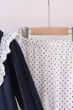 Unit price perDress your little one in festive fun with this Navy Nativity Embroidery Ruffle Pants Set. Featuring charming nativity-themed embroidery and playful ruffles, this set adds a touch of holiday magic to any occasion. Soft, comfortable fabric ensures all-day wearability while the detailed design brings joyful spirit to celebrations. Perfect for creating cute, memorable moments during the festive season.