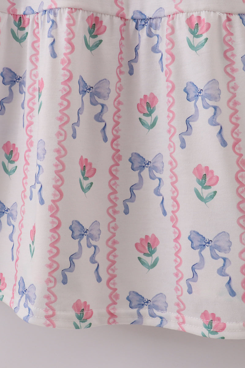 Blue floral bow print smocked mom dress